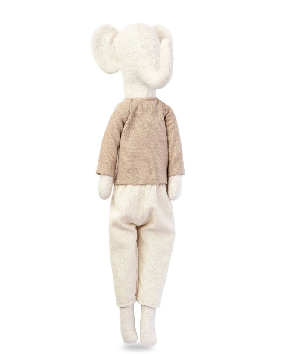 A charming cotton and linen soft toy elephant with backpack – all ready for adventure!