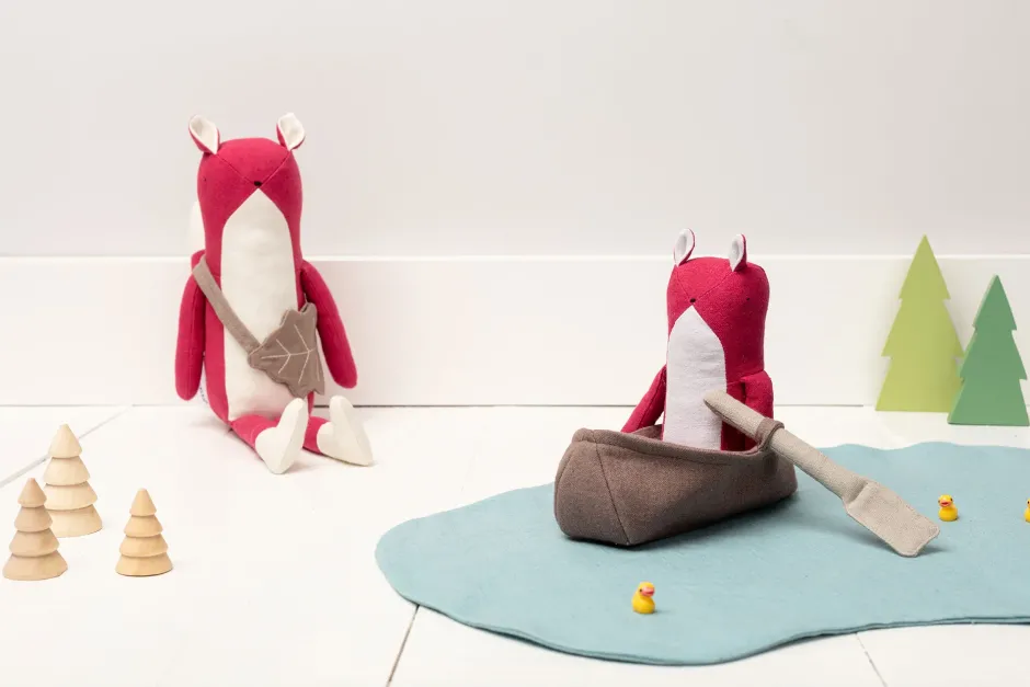 A charming cotton and linen soft toy fox with her own linen boat – all ready for watery adventures!
