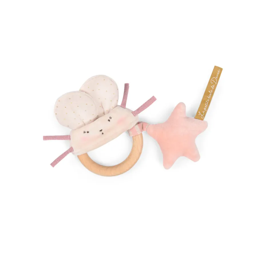 Moulin Roty wooden ring rattle / activity mouse – crinkly ears and rattle star