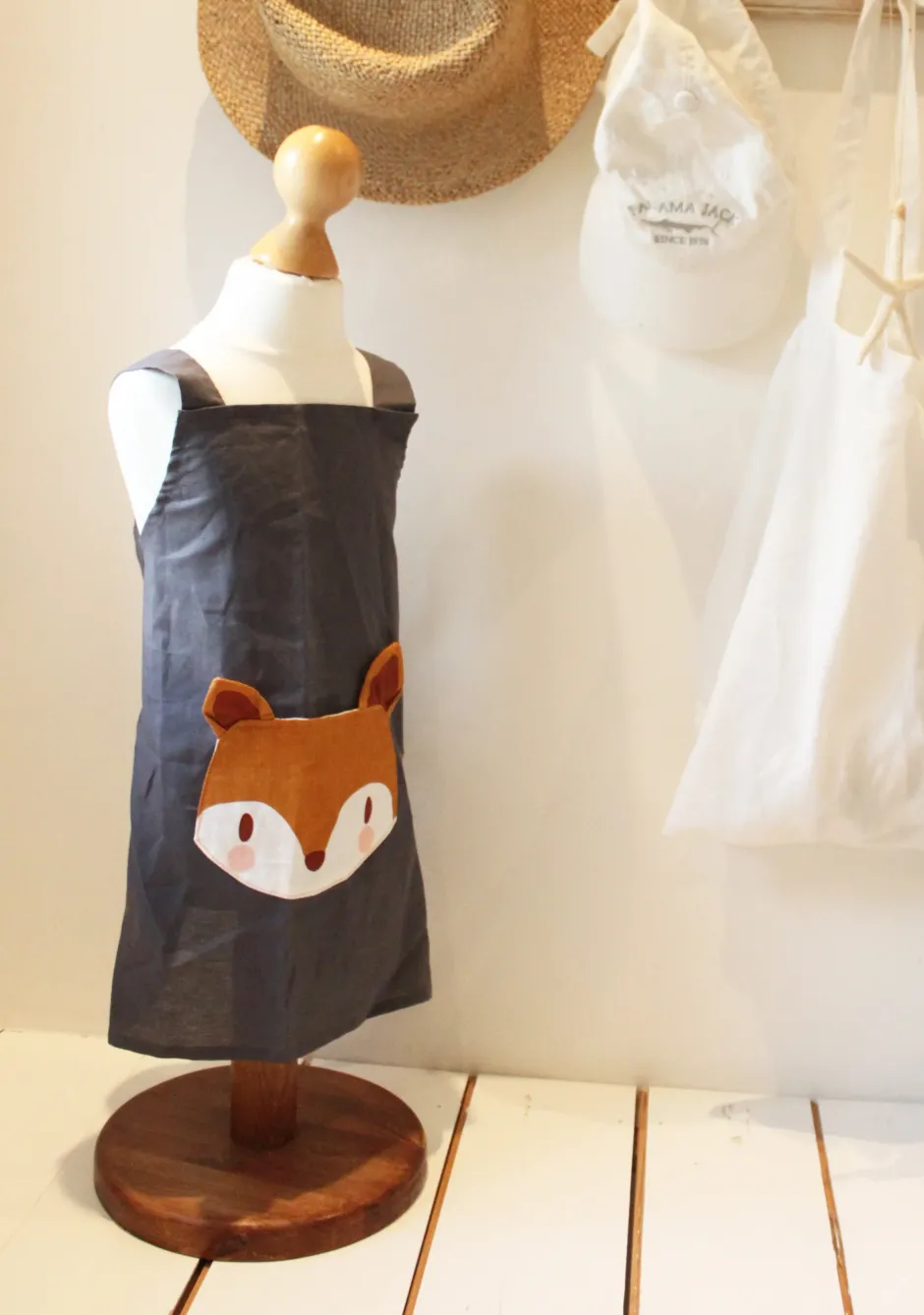 A lovely linen apron with adjustable crossover straps at the back, suitable for 3 – 8 years.Beautiful linen fabric with patch pocket fox on the front.
