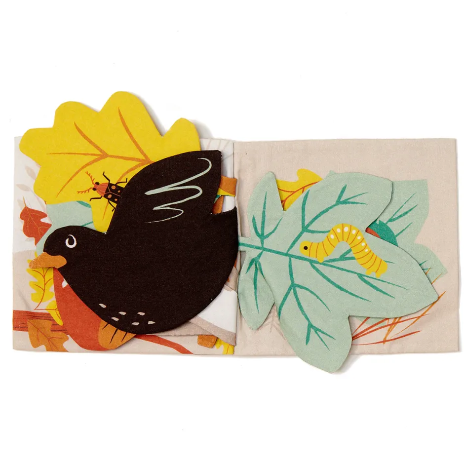 A simple design in striking autumnal colours – front and back fabric covers contain six crinkly cut out fabric pages: toadstool, blackbird, bunny, leaf with caterpillar, leaf with beetle, and fox.