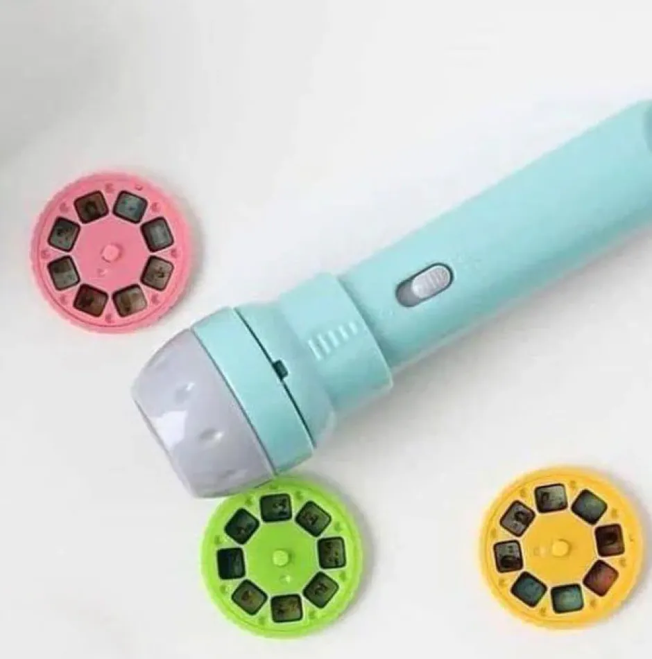 Click a disc into place at the end of the torch, then rotate with your finger to see different images projected on the wall.