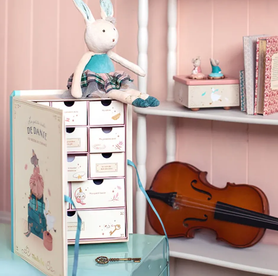 ‘A collection full of poetry with powdery tones and subtle embroidered details’ is how Moulin Roty describe the exquisite nursery range ‘La Petite Ecole de Danse’ – or The Little Dance School. Bunnies, mice and swans learn their first steps in this charming little world of toys, rattles and nursery accessories.