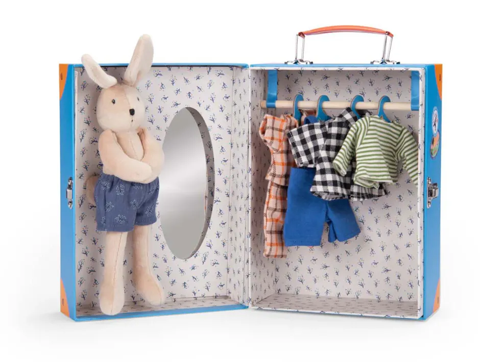 Lovely Moulin Roty play set comprises a small Sylvain rabbit with outfits, presented in her own gorgeous wardrobe style suitcase.