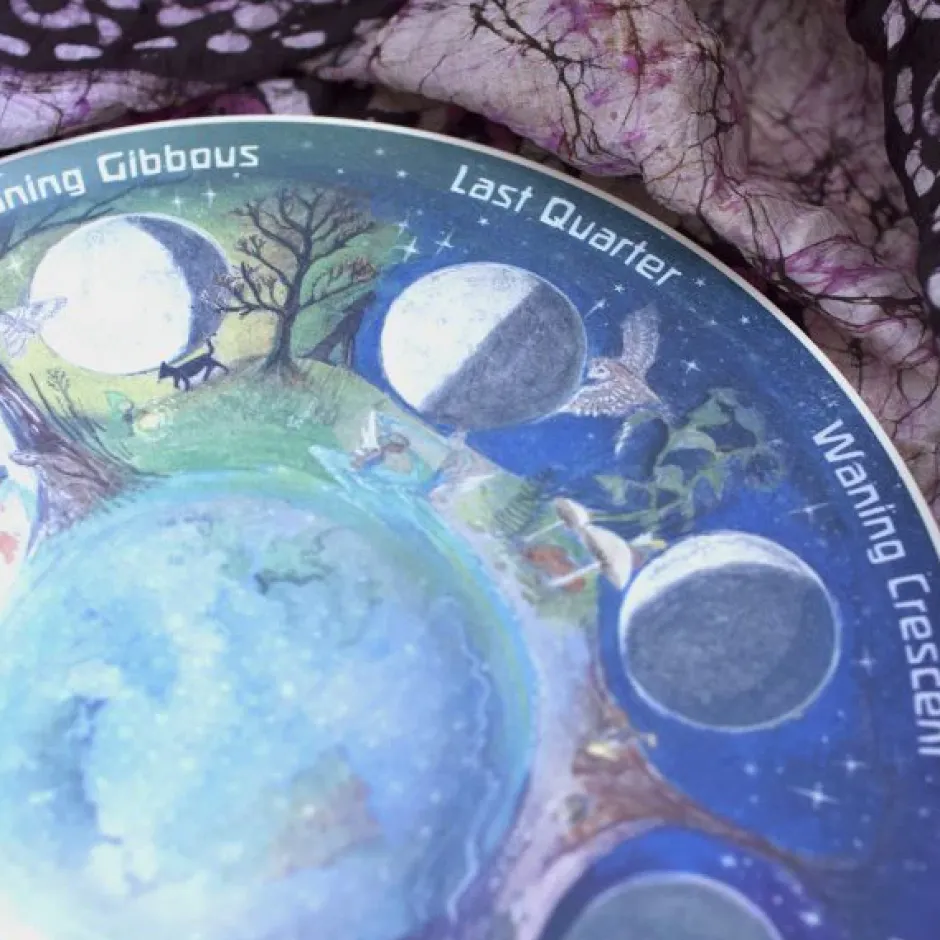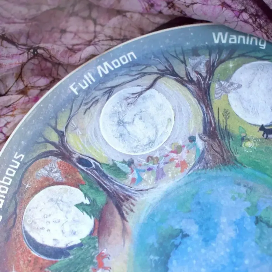 This wheel displays the phases of the moon around a lunar month with illustrations showing woodland activities under the light of the moon.