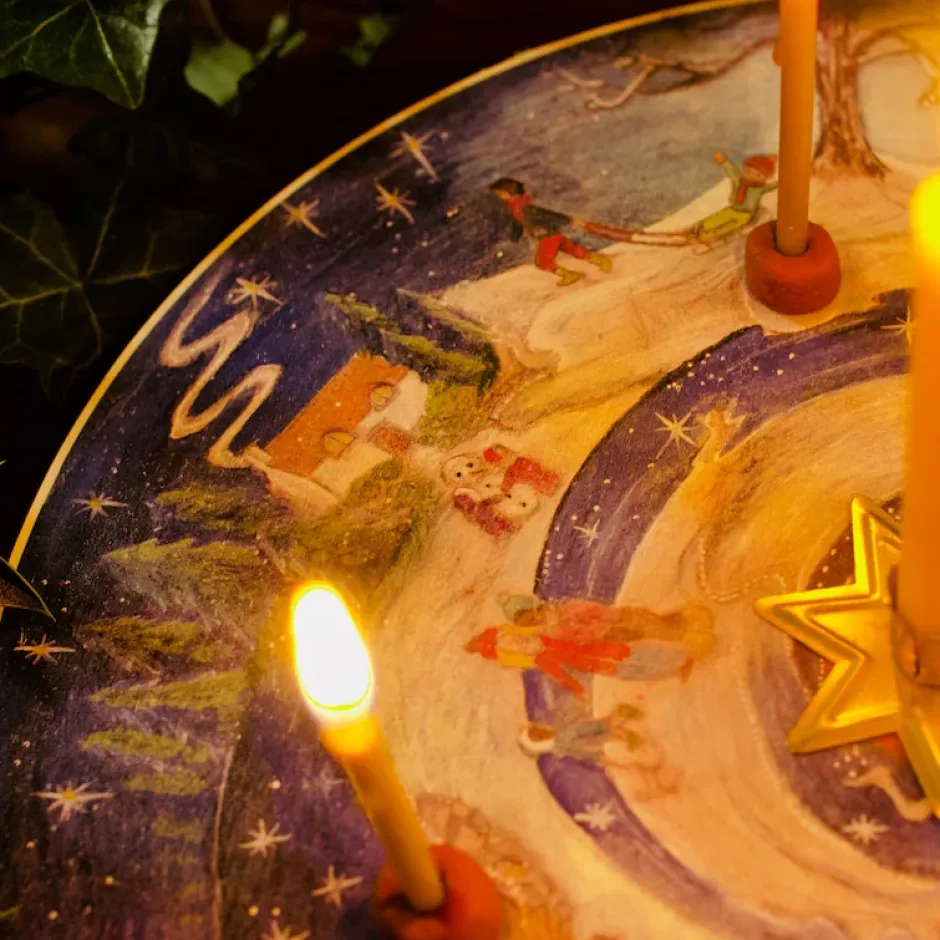 It can also be nice to interact with the wheel as the weeks pass, perhaps stepping a little toy around the wintery world, or lighting and placing candles through the advent period (with adult supervision, clearly).