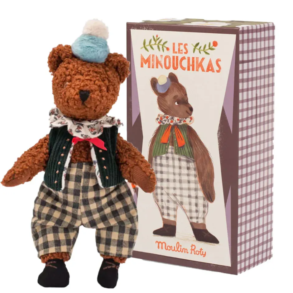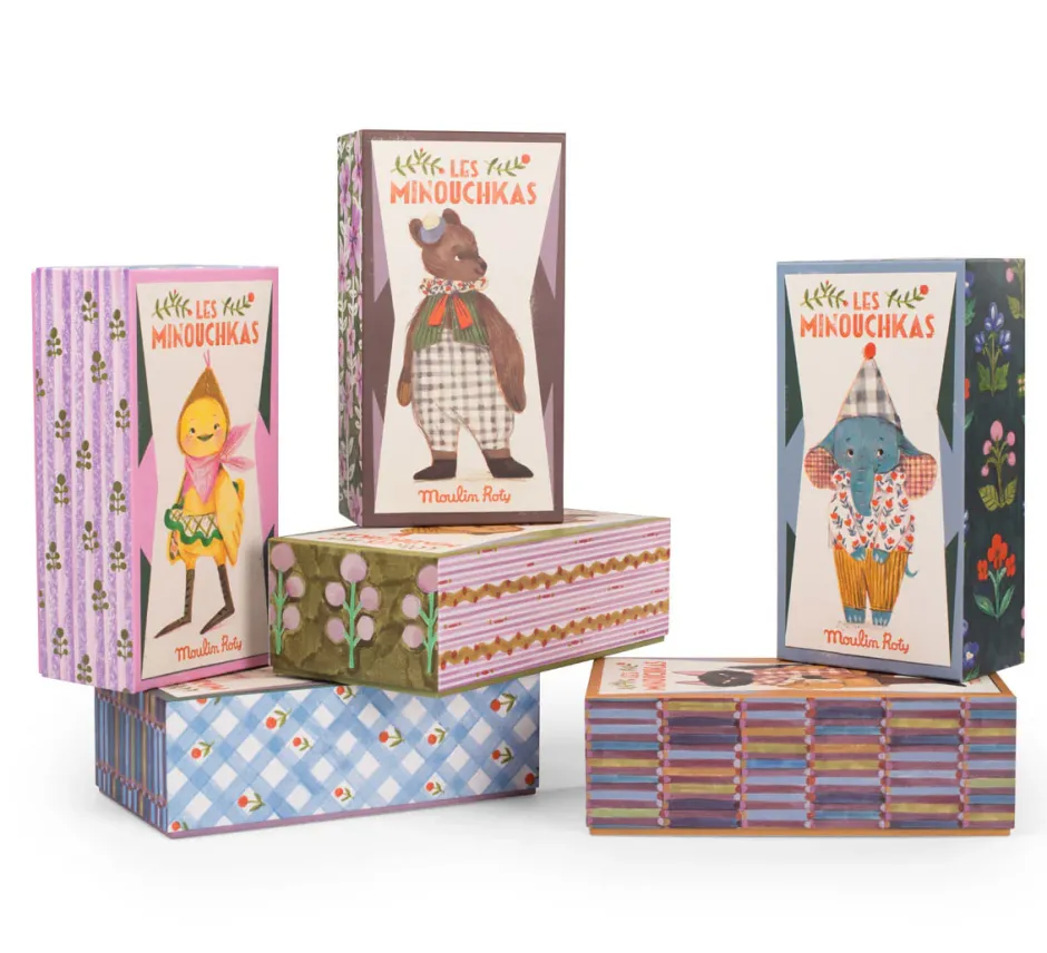 Like little works of art – Les Minouchkas exquisite fabric animals from Moulin Roty, each one presented in a beautifully decorated gift box.