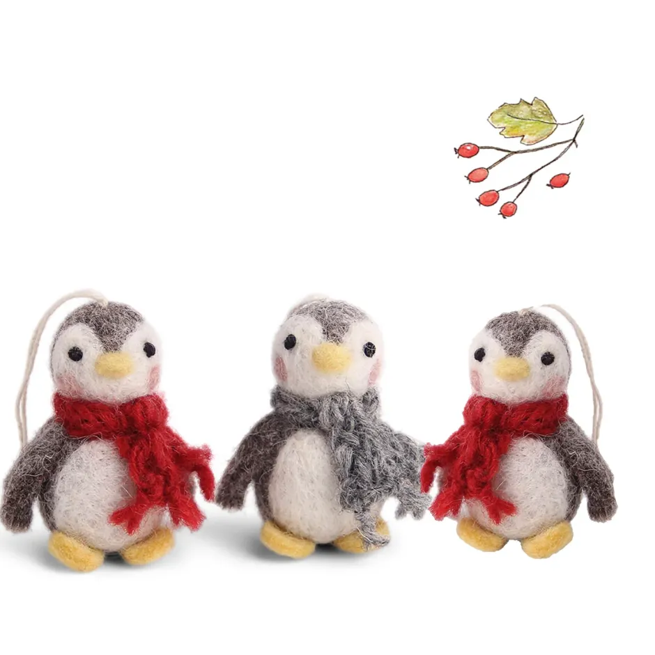 Three little penguin babies, each wearing a woolly scarf