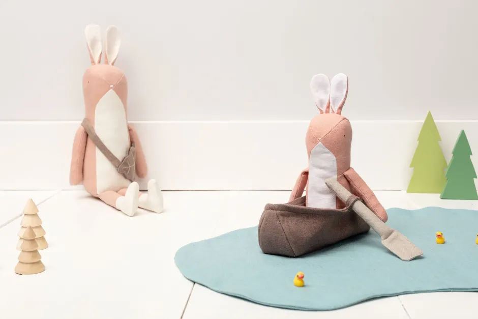 A charming cotton and linen soft toy rabbit with her own linen boat – all ready for watery adventures!
