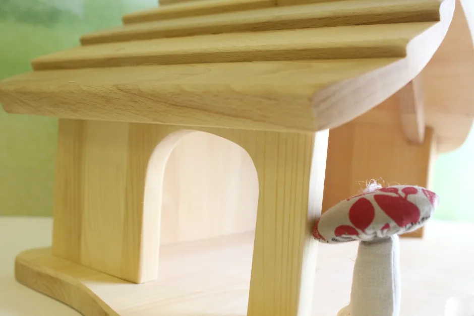 A truly beautiful wooden play cottage / barn handmade by Gluckskafer, suitable for play with a whole host of little animals and characters.